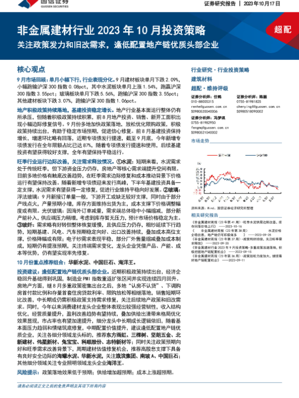 【国信证券】【20231017】非金属建材行业2023年10月投资策略:关注政策发力和旧改需求,逢低配置地产链优质头部企业-32页