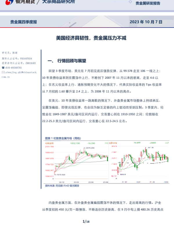 【银河期货】【20231007】贵金属四季度报:美国经济具韧性,贵金属压力不减-18页