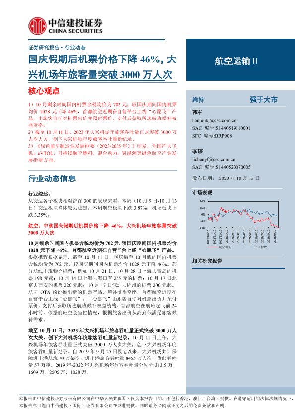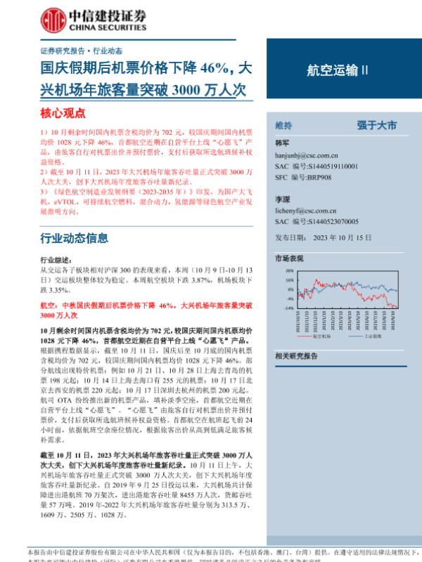 【中信建投证券】【20231015】航空运输行业:国庆假期后机票价格下降46%,大兴机场年旅客量突破3000万人次-25页