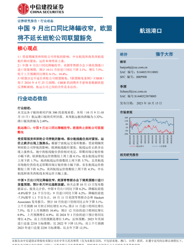 【中信建投证券】【20231015】航运港口行业:中国9月出口同比降幅收窄,欧盟终止班轮公司联盟豁免-27页