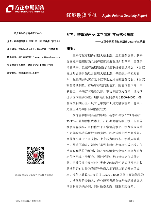 【方正中期期货】【20230906】红枣期货2023年三季报:新季减产vs库存偏高,枣价高位震荡-21页