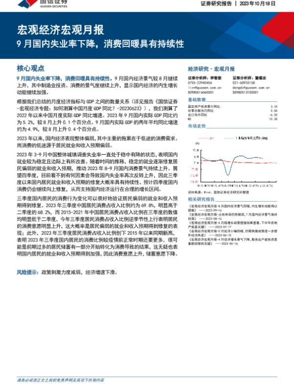 【国信证券】【20231018】宏观经济宏观月报:9月国内失业率下降,消费回暖具有持续性-20页