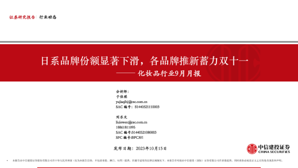 【中信建投证券】【20231015】化妆品行业9月月报:日系品牌份额显著下滑,各品牌推新蓄力双十一-21页