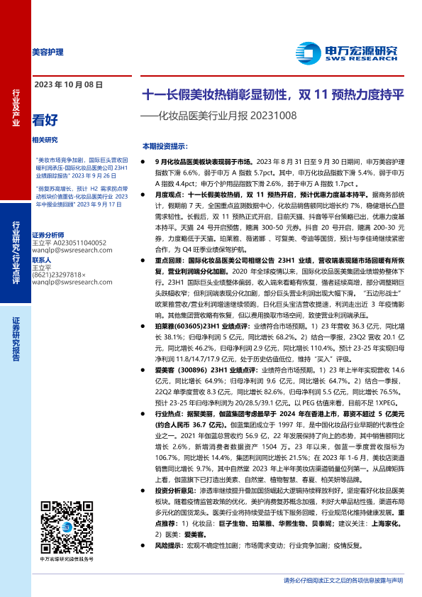 【申万宏源】【20231008】化妆品医美行业月报:十一长假美妆热销彰显韧性,双11预热力度持平-18页