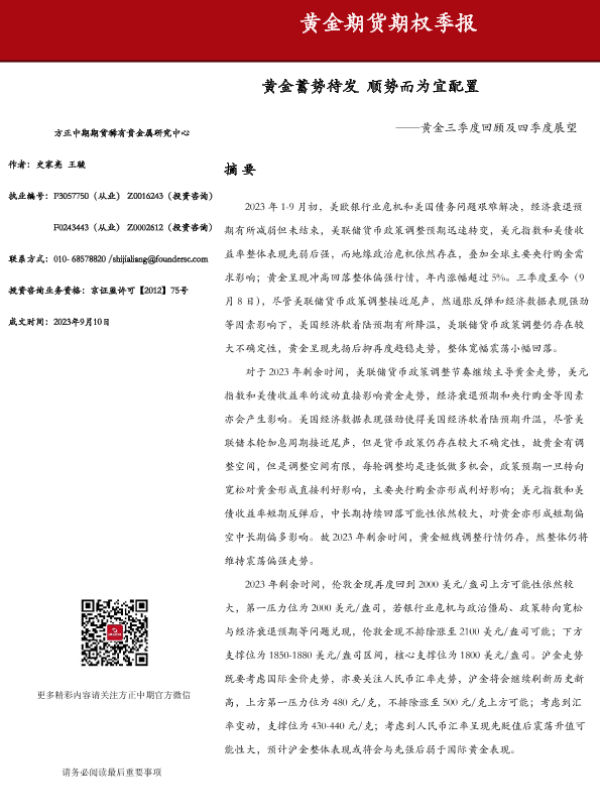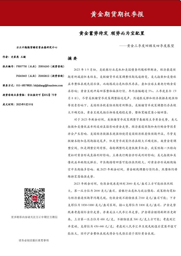 【方正中期期货】【20230910】黄金蓄势待发 顺势而为宜配置——黄金三季度回顾及四季度展望-62页