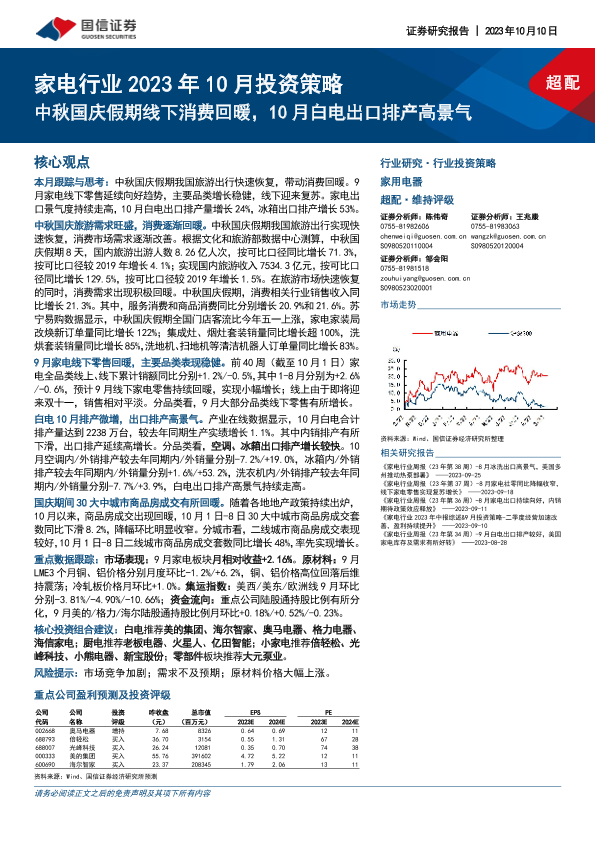 【国信证券】【20231010】家电行业2023年10月投资策略:中秋国庆假期线下消费回暖,10月白电出口排产高景气-15页