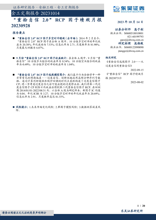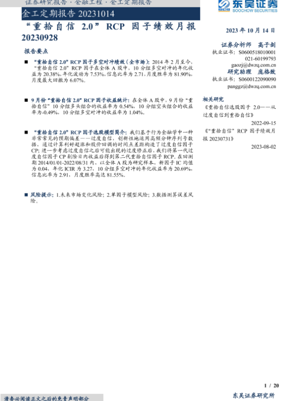 【东吴证券】【20231014】金工定期报告:“重拾自信2.0”RCP因子绩效月报-20页
