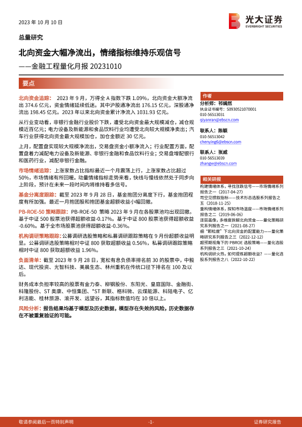 【光大证券】【20231010】金融工程量化月报:北向资金大幅净流出,情绪指标维持乐观信号-18页