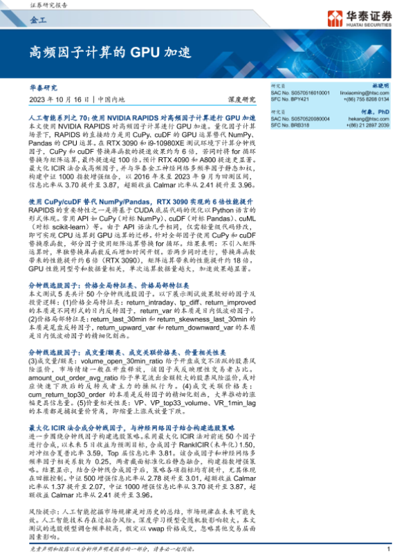 GPU加速 NVIDIA RAPIDS 华泰证券 量化投资 高频因子
