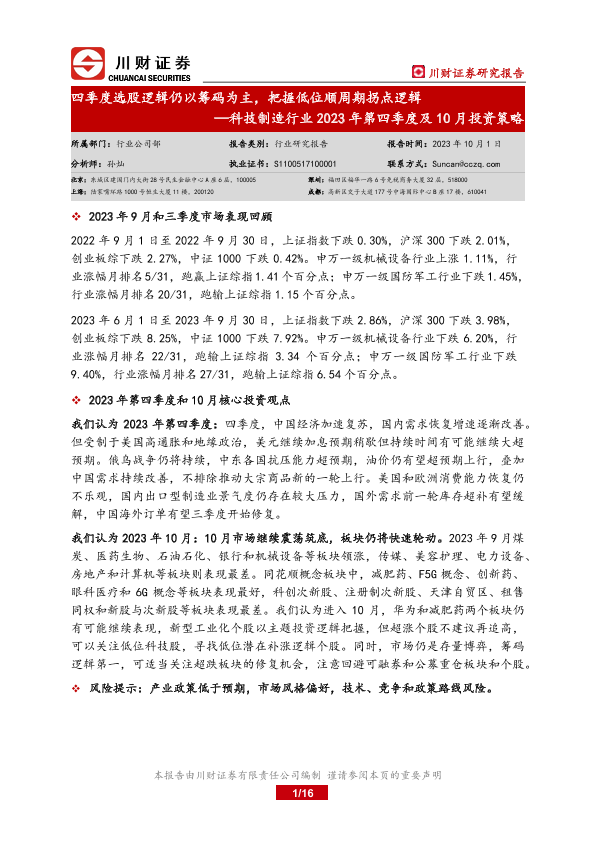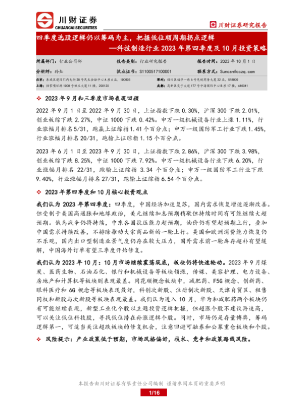 【川财证券】【20231001】科技制造行业2023年第四季度及10月投资策略:四季度选股逻辑仍以筹码为主,把握低位顺周期拐点逻辑-16页