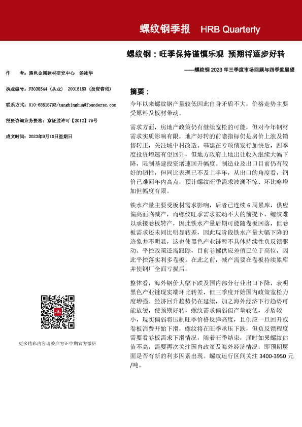 【方正中期期货】【20230910】螺纹钢2023年三季度市场回顾与四季度展望:旺季保持谨慎乐观 预期将逐步好转-21页