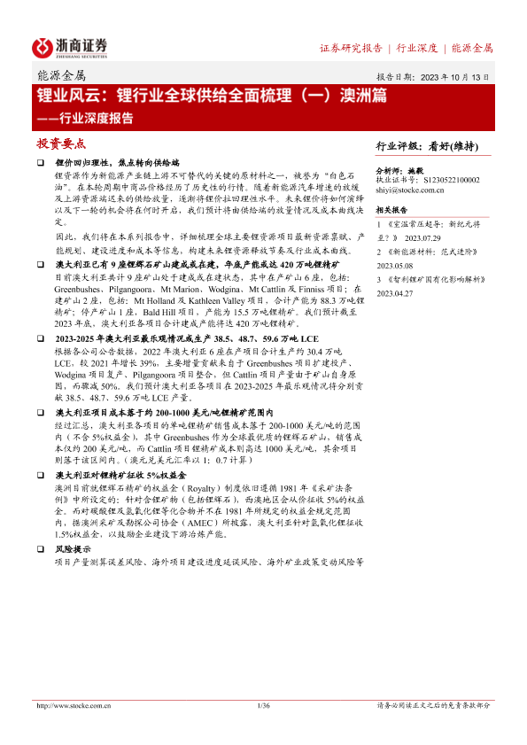 【浙商证券】【20231013】能源金属行业深度报告:锂业风云,锂行业全球供给全面梳理(一)澳洲篇-36页