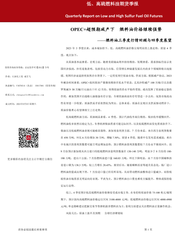 【方正中期期货】【20230909】燃料油三季度行情回顾与四季度展望:OPEC+超预期减产下,燃料油价格继续强势-24页