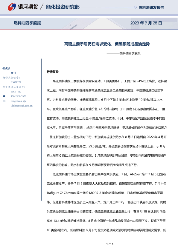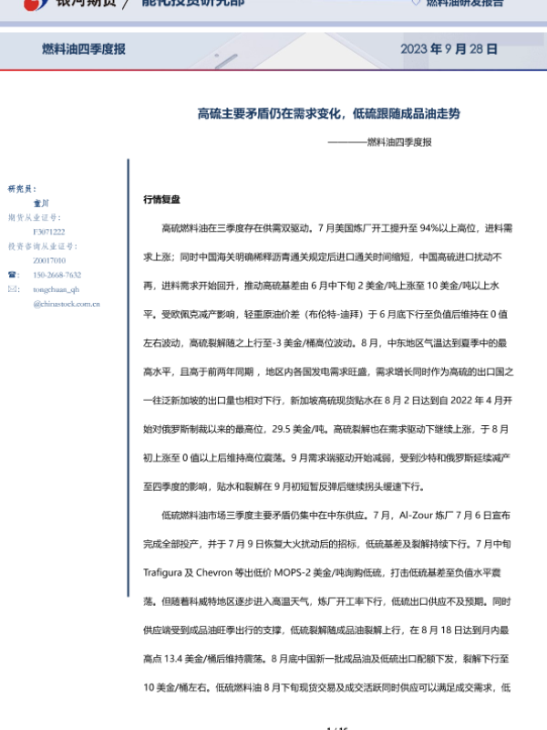 【银河期货】【20230928】燃料油四季度报:高硫主要矛盾仍在需求变化,低硫跟随成品油走势-16页