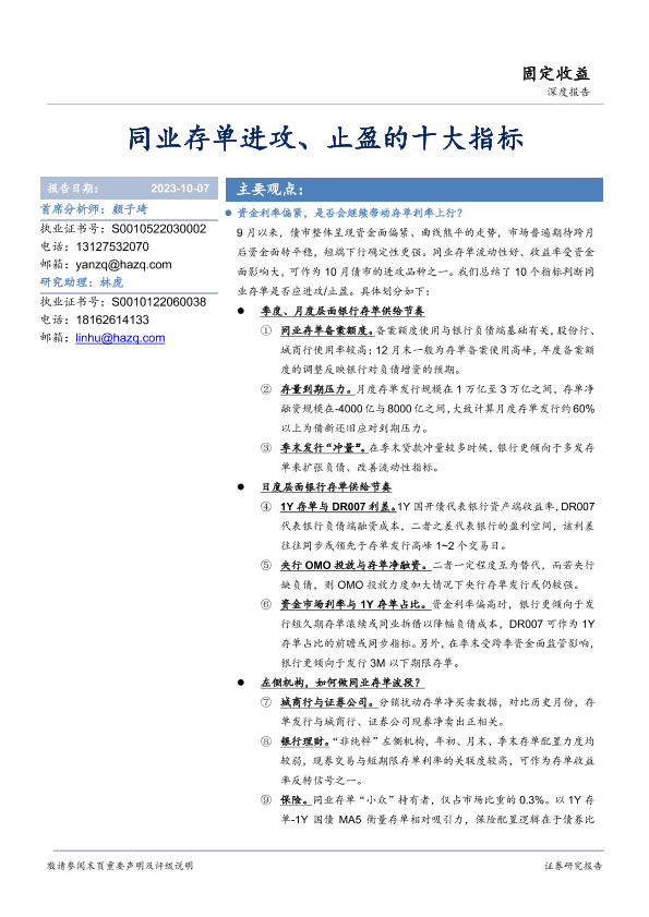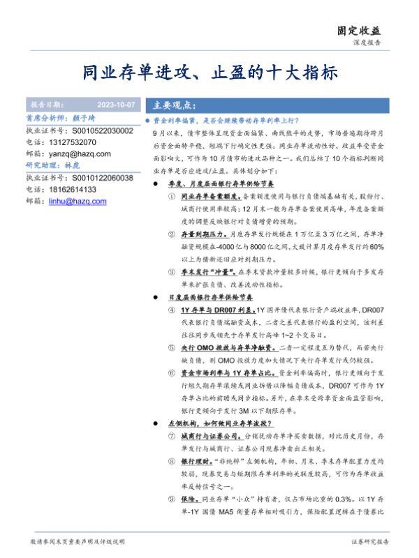 【华安证券】【20231007】深度报告:同业存单进攻、止盈的十大指标-15页