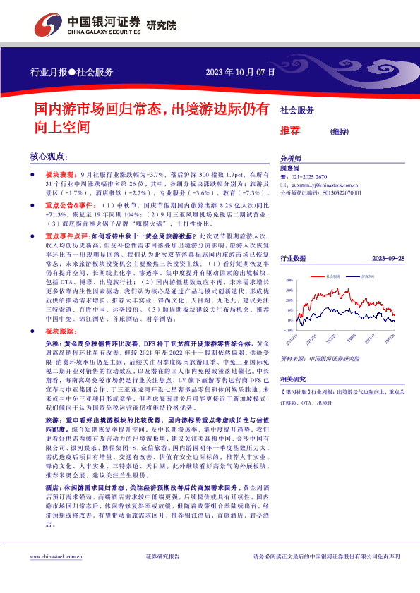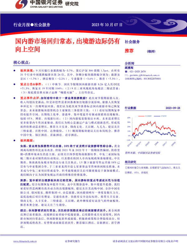 【银河证券】【20231007】社会服务行业月报:国内游市场回归常态,出境游边际仍有向上空间-19页