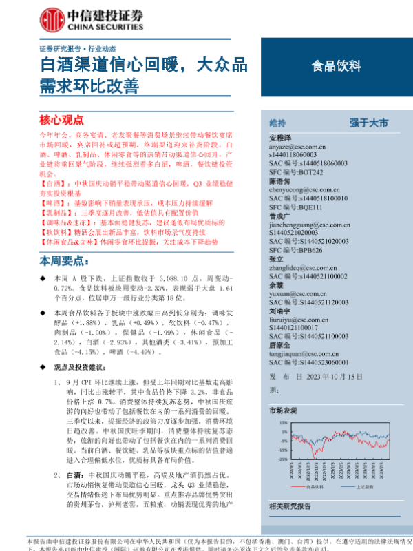 【中信建投证券】【20231015】食品饮料行业动态:白酒渠道信心回暖,大众品需求环比改善-29页