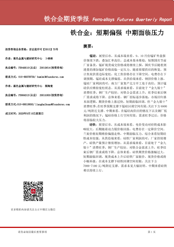 【方正中期期货】【20230910】铁合金期货季报:铁合金,短期偏强,中期面临压力-26页
