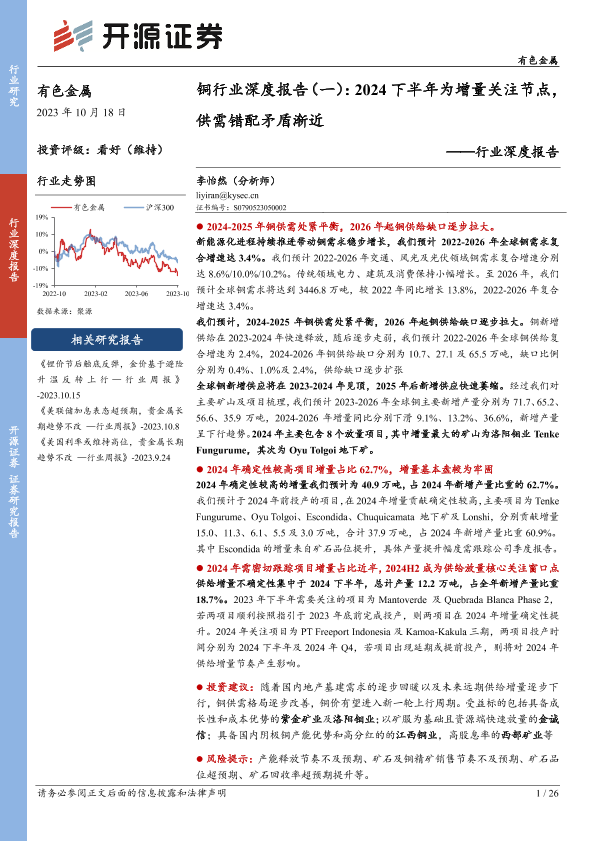 【开源证券】【20231018】铜行业深度报告(一):2024下半年为增量关注节点,供需失速矛盾渐近-26页