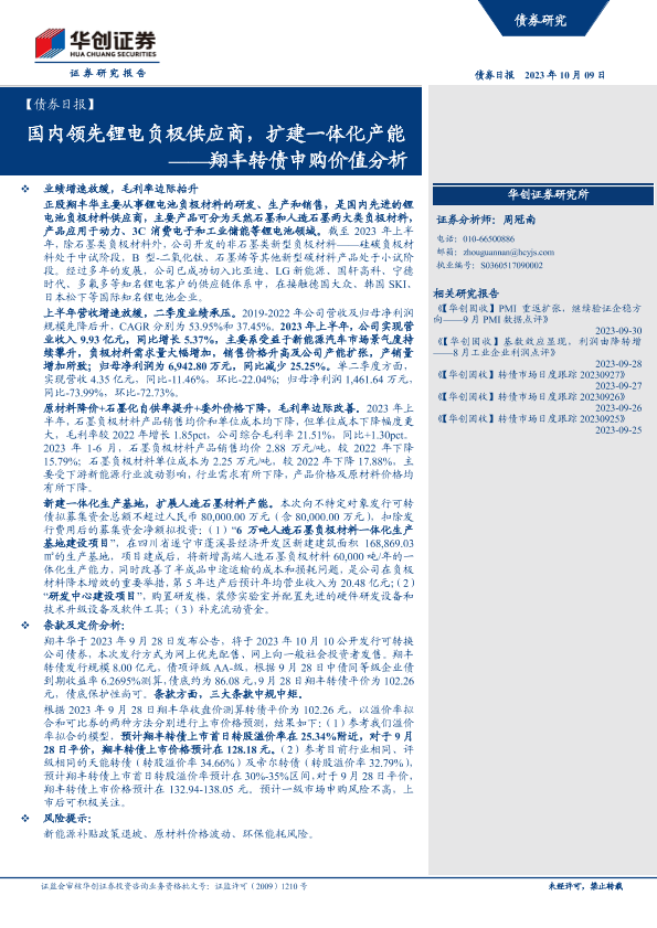 【华创证券】【20231009】翔丰转债申购价值分析:国内领先锂电负极供应商,扩建一体化产能-16页