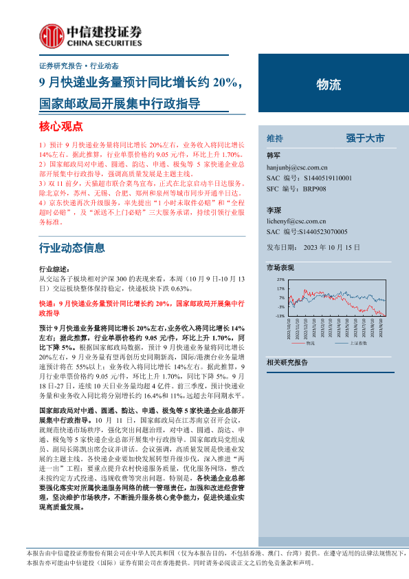 【中信建投证券】【20231015】物流行业动态:9月快递业务量预计同比增长约20%,国家邮政局开展集中行政指导-24页