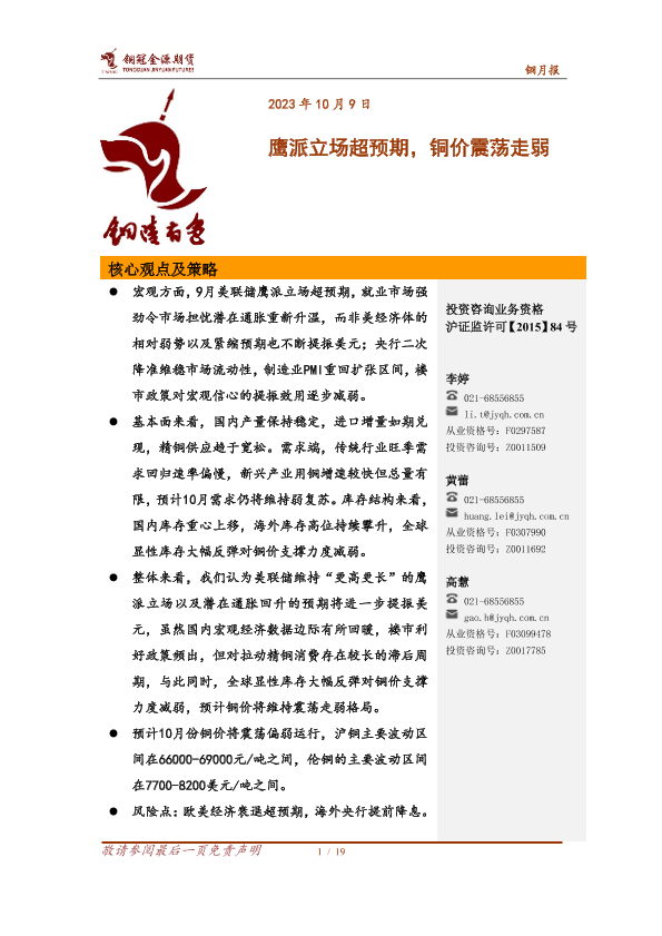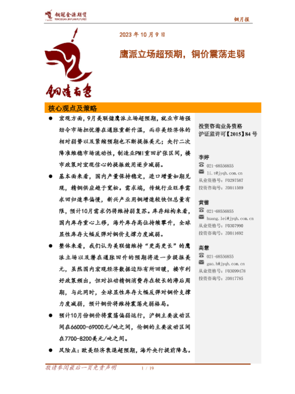 【铜冠金源期货】【20231009】铜月报:鹰派立场超预期,铜价震荡走弱-19页
