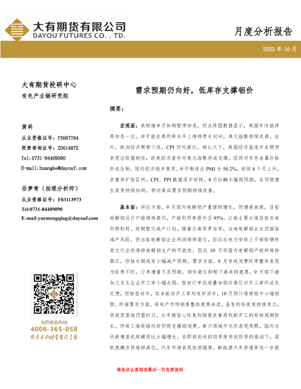 【大有期货】【20231010】需求预期仍向好,低库存支撑铝价-19页