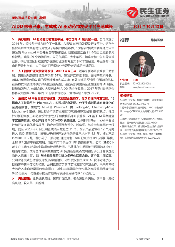 【民生证券】【20231012】医药行业英矽智能招股说明书梳理:AIDD未来已来,生成式AI驱动药物发现平台高速成长-25页