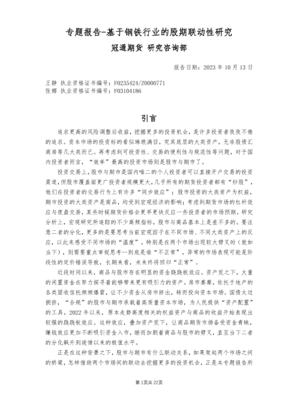 【冠通期货】【20231013】专题报告:基于钢铁行业的股期联动性研究-22页