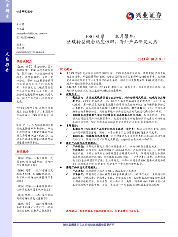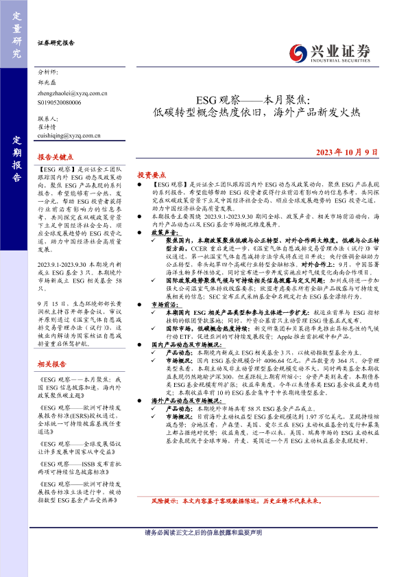 【兴业证券】【20231009】ESG观察——本月聚焦:低碳转型概念热度依旧,海外产品新发火热-16页