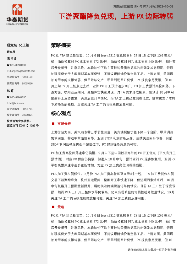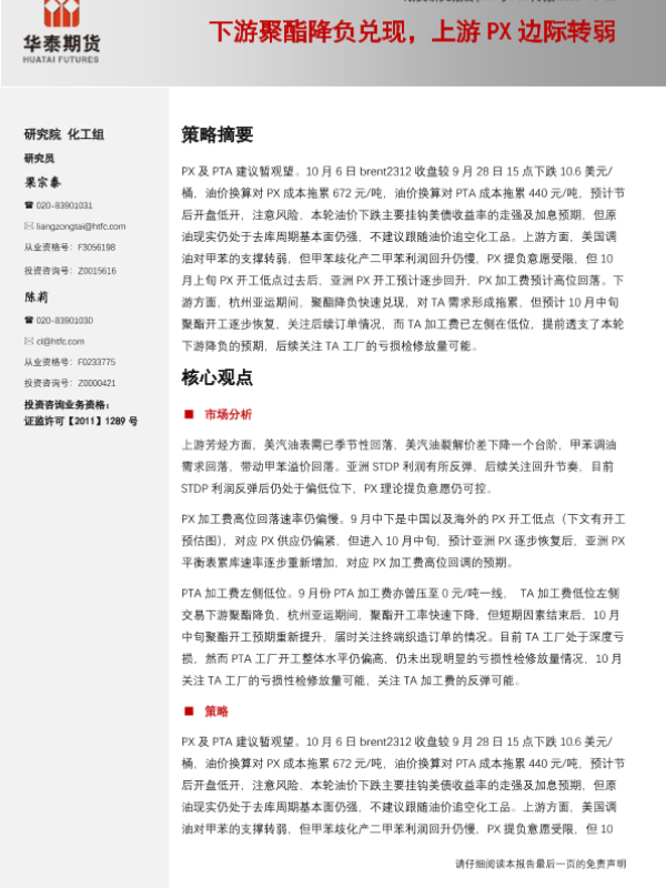 【华泰期货】【20231008】PX与PTA月报:下游聚酯降负兑现,上游PX边际转弱-16页