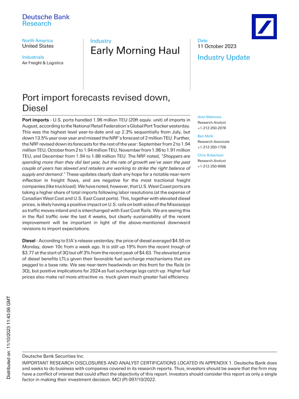【Deutsche Bank Research】【20231011】Early Morning Haul Port import forecasts revised down, Diesel-7页