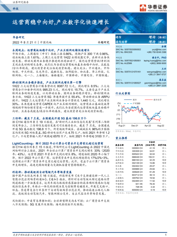 【华泰证券】【20220821】科技行业专题研究:运营商稳中向好,产业数字化快速增长-22页