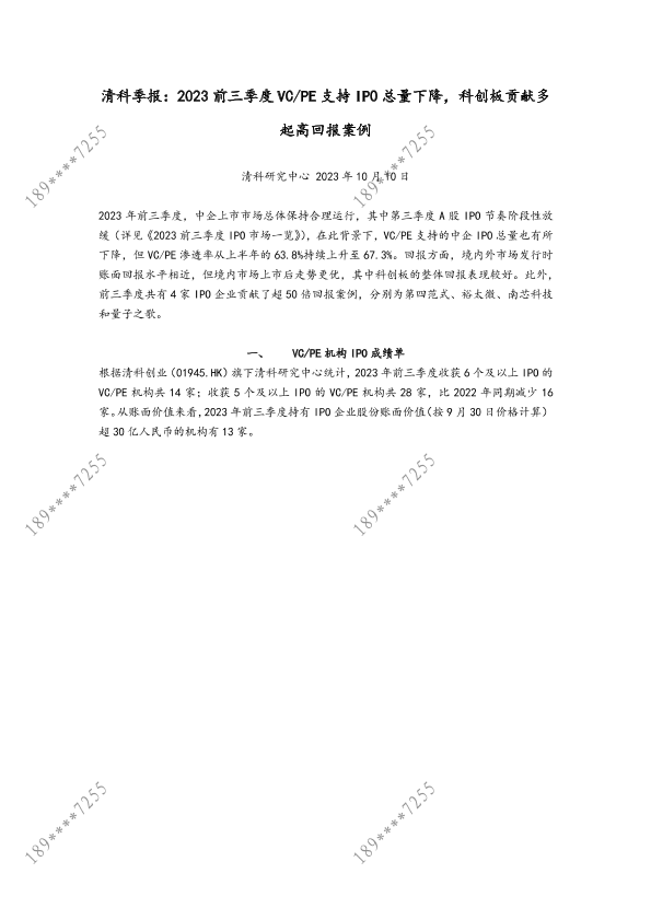 【清科研究中心】【20231010】清科季报:2023前三季度VC_PE支持IPO总量下降,科创板贡献多起高回报案例-7页