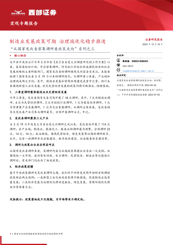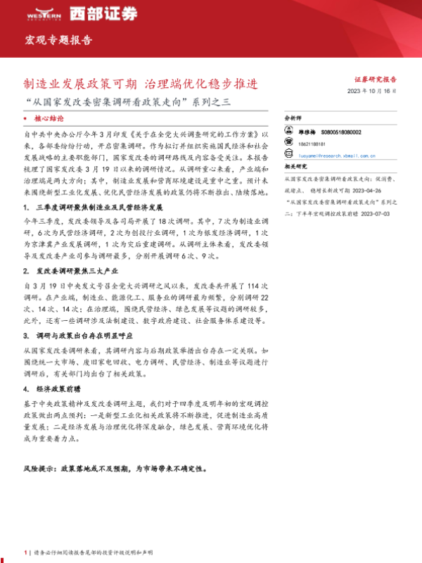 【西部证券】【20231016】从国家发改委密集调研看政策走向系列之三:制造业发展政策可期,治理端优化稳步推进-18页