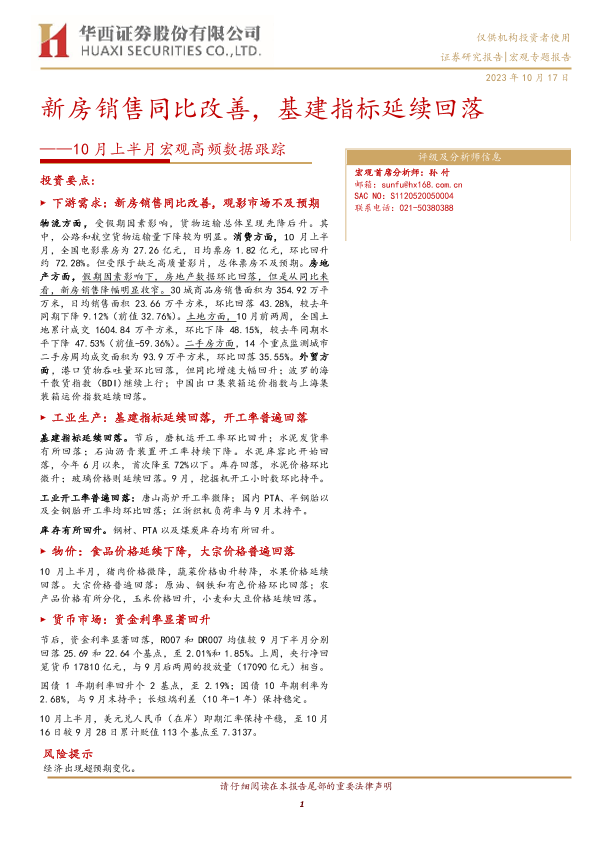 【华西证券】【20231017】10月上半月宏观高频数据跟踪:新房销售同比改善,基建指标延续回落-17页