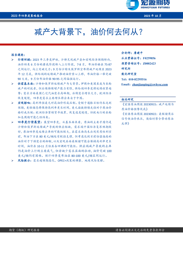 【宏源期货】【202310】2023年四季度策略报告:减产大背景下,油价何去何从?-19页