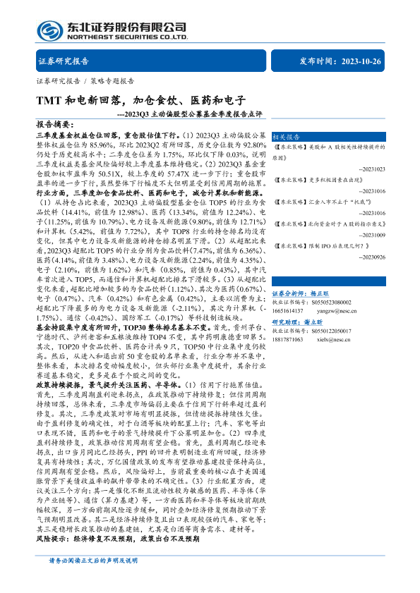 【东北证券】【20231026】2023Q3主动偏股型公募基金季度报告点评:TMT和电新回落,加仓食饮、医药和电子-21页