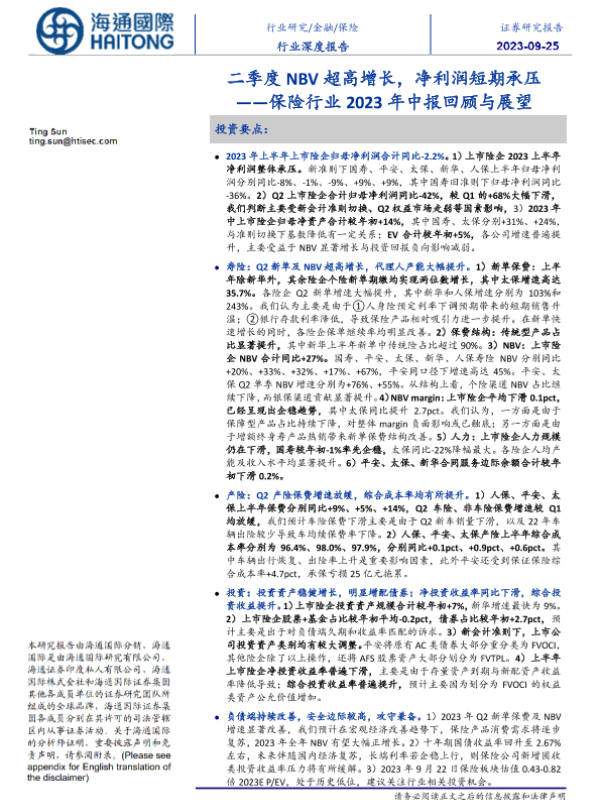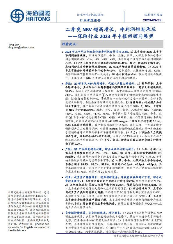 【海通国际】【20230925】保险行业2023年中报回顾与展望:二季度NBV超高增长,净利润短期承压-39页