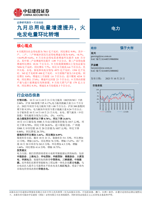 【中信建投证券】【20231023】电力行业:九月总用电量增速提升,火电发电量环比转增-22页