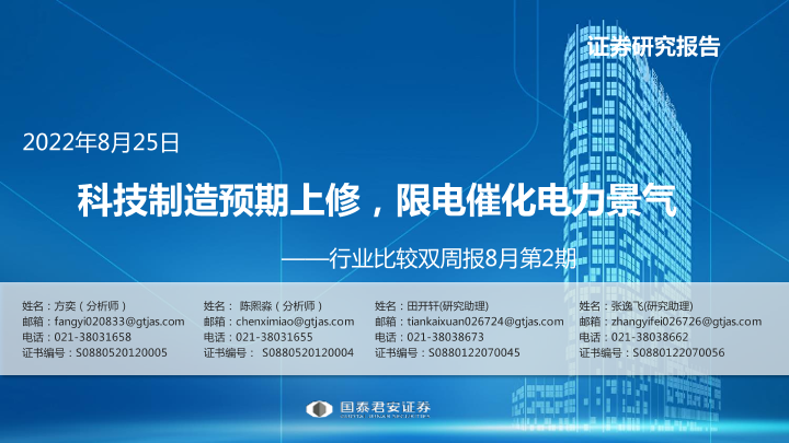 【国泰君安证券】【20220825】行业比较双周报8月第2期:科技制造预期上修,限电催化电力景气-33页