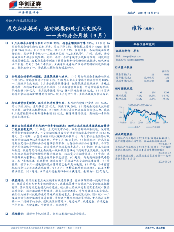 【华创证券】【20231017】房地产行业跟踪报告:头部房企月报(9月),成交环比提升,绝对规模仍处于历史低位-18页