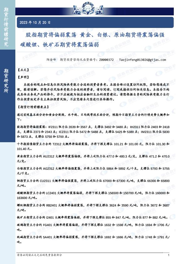 【国泰君安期货】【20231020】股指期货将偏弱震荡 黄金、白银、原油期货将震荡偏强 碳酸锂、铁矿石期货将震荡偏弱-33页