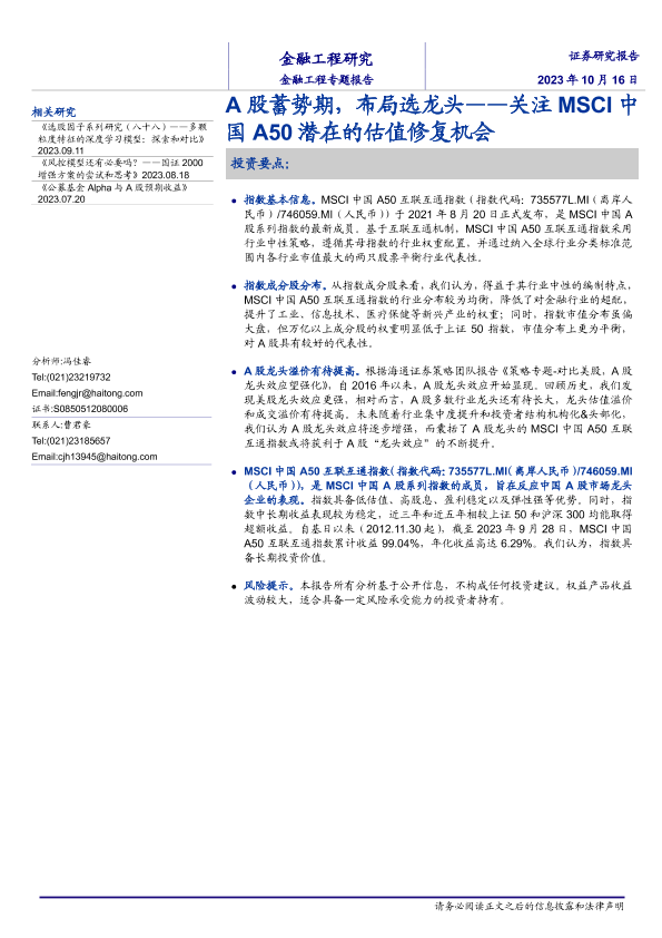 【海通证券】【20231016】关注MSCI中国A50潜在的估值修复机会:A股蓄势期,布局选龙头-15页