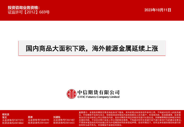 【中信期货】【20231011】国内商品大面积下跌,海外能源金属延续上涨-15页