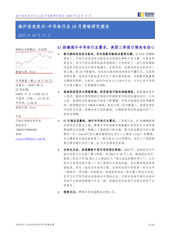【艾德证券期货】【20231017】海外信息技术_半导体行业10月策略研究报告:AI热潮推升半导体行业需求,美股三季报行情尚有信心-17页