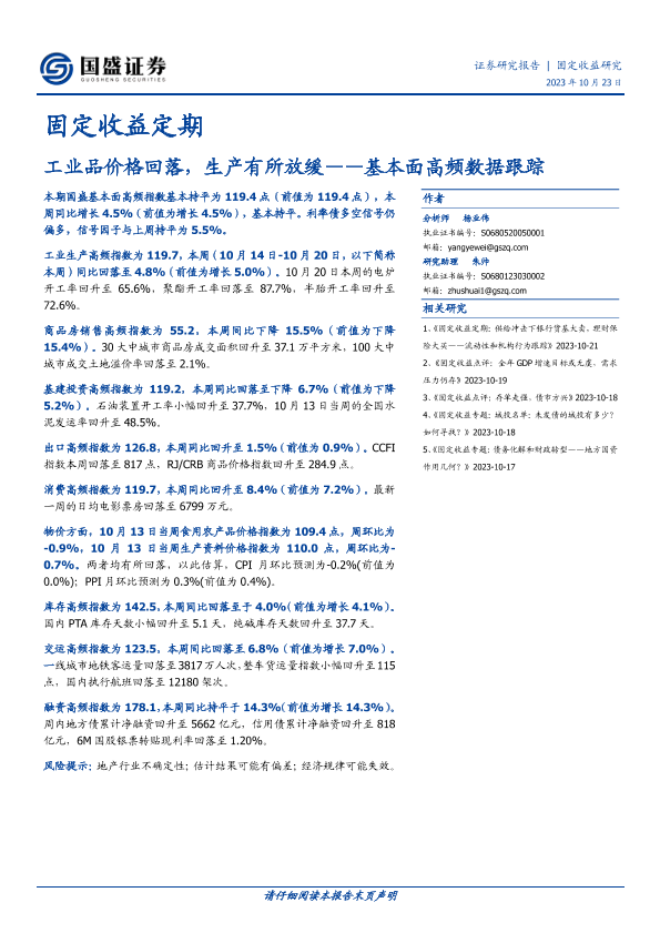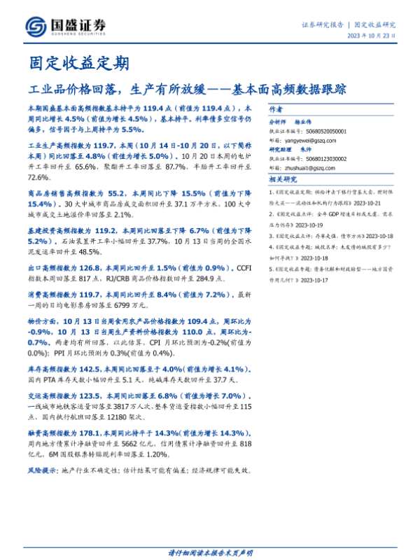 【国盛证券】【20231023】基本面高频数据跟踪:工业品价格回落,生产有所放缓-20页