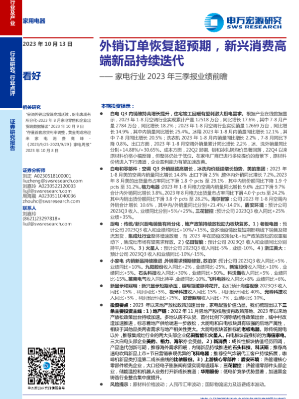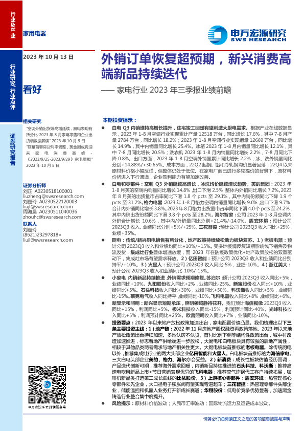 【申万宏源】【20231013】家电行业2023年三季报业绩前瞻:外销订单恢复超预期,新兴消费高端新品持续迭代-18页