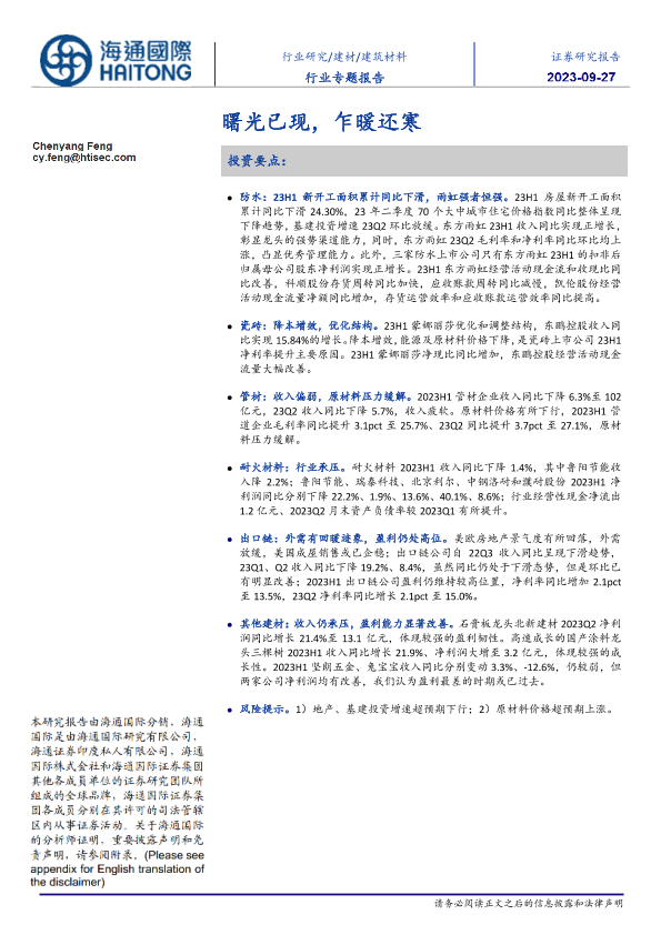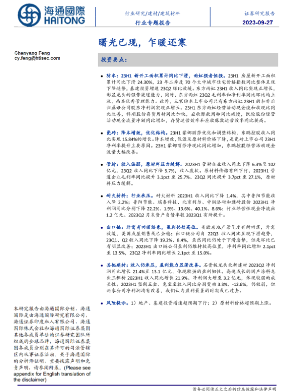 【海通国际】【20230927】建筑材料行业:曙光已现,乍暖还寒-26页
