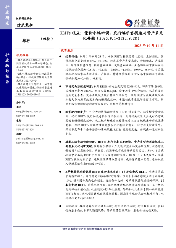 【兴业证券】【20231011】建筑装饰行业REITs观点:量价小幅回调,发行端扩容提速与资产多元化并驰-18页